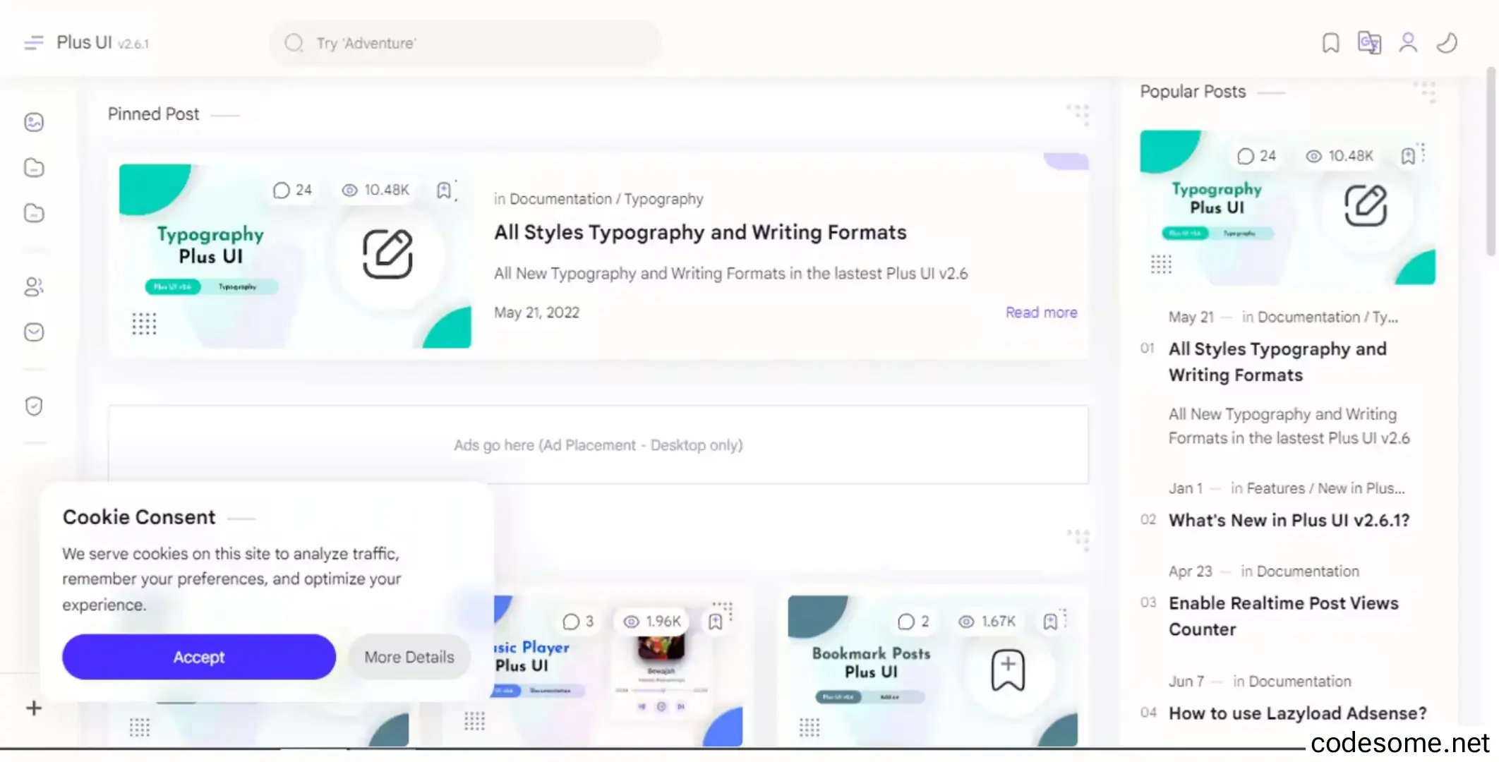 Numerous features are included in the Plus UI template to assist you in creating a visually appealing website. Along with Google Fonts, it offers a variety of typographic choices that can enhance the visual appeal and appeal of your content. Additionally, the template comes with a number of widgets and modules that can help boost website engagement, like a featured section and a popular posts section.