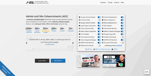 Admin and Site Enhancements (ASE) Pro is a premium WordPress utility and optimization plugin. Unlike page builders or SMTP tools, its purpose is not to add a single major feature but to provide a comprehensive suite of over 100+ smaller tweaks, security hardening, and workflow improvements that clean up and streamline the WordPress admin dashboard (for you, your clients, or your team) and optimize the site's frontend.